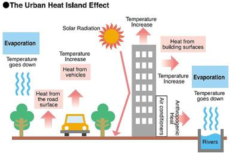 Green roofs, walls, and parks help to reduce urban heat island effects, lowering temperatures in urban areas.
